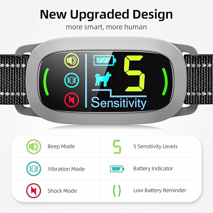- Safer Humanized Setting: The dog bark collar has 4 working modes, no shock mode: beep, vibration, beep+vibration; Shock mode: beep+vibration+shock, 5 adjustable sensitivity levels; Just press the M button to switch the mode at will, you can enjoy quiet time
