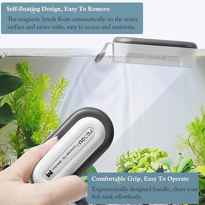 - 【Floating Design, Easy To Operate】The aquarium magnetic cleaner has strong buoyancy. After being placed in water, the internal brush can easily float on the surface of the water without sinking to the bottom of the fish tank, making it very convenient to remove. Cleaning and maintenance will not wet hands, saving time and effort. Humanized handle design, comfortable grip, more convenient operation, making fish tank cleaning easier and more efficient.