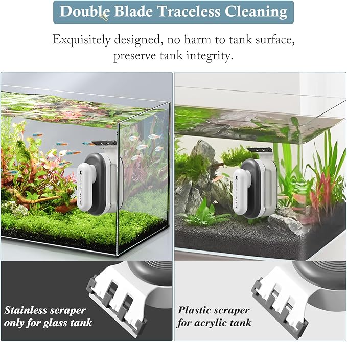 - 【Dual Blade Design】The fish tank cleaner is equipped with 2pcs algae scrapers of different materials, suitable for different tanks. The stainless steel blade is only suitable for glass fish tanks, while plastic blade is suitable for acrylic fish tanks. The blades will not scratch the fish tank and thoroughly remove stubborn dirt and algae.