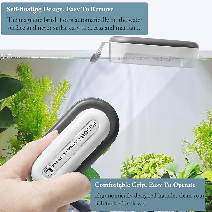- 【Floating Design, Easy To Operate】The aquarium magnetic cleaner has strong buoyancy. After being placed in water, the inner brush can easily float on the surface of the water without sinking to the bottom of the fish tank, making it very convenient to remove. Cleaning and maintenance will not wet hands, saving time and effort. Humanized handle design, comfortable grip, more convenient operation, making fish tank cleaning easier and more efficient.