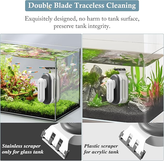 - 【Dual Blade Design】The fish tank cleaner is equipped with 2pcs algae scrapers of different materials, suitable for different tanks. The stainless steel blade is only suitable for glass fish tanks, while plastic blade is suitable for acrylic fish tanks. The blades will not scratch the fish tank and thoroughly remove stubborn dirt and algae.