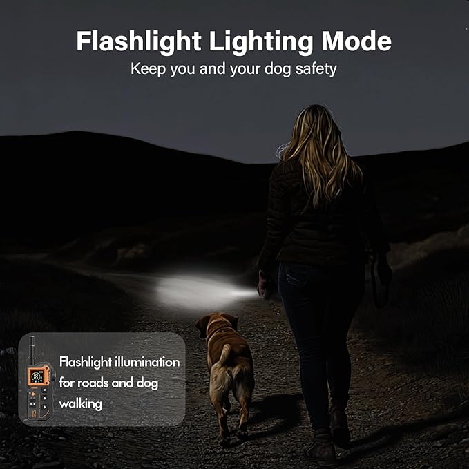 - 3 Humane and Effective Training Modes: This dog training collar offers four adjustable modes—beep, vibration (1-9 levels), safe shock (1-18 levels)—ensuring tailored and safe training for your dog, helping curb undesirable behaviors effectively. And the remote control also has a light, which can illuminate the road when you go out at night