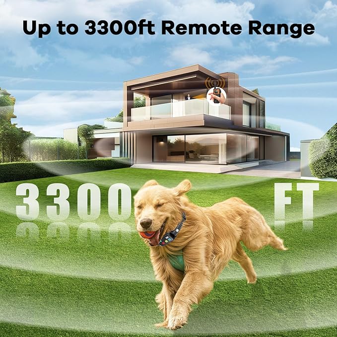 - 3300FT Remote Range & 2 Channel: With an impressive 3300FT range, this collar allows your dog the freedom to roam while staying within reach. The remote supports two collars simultaneously, making it perfect for training two dogs at once without the need for resetting