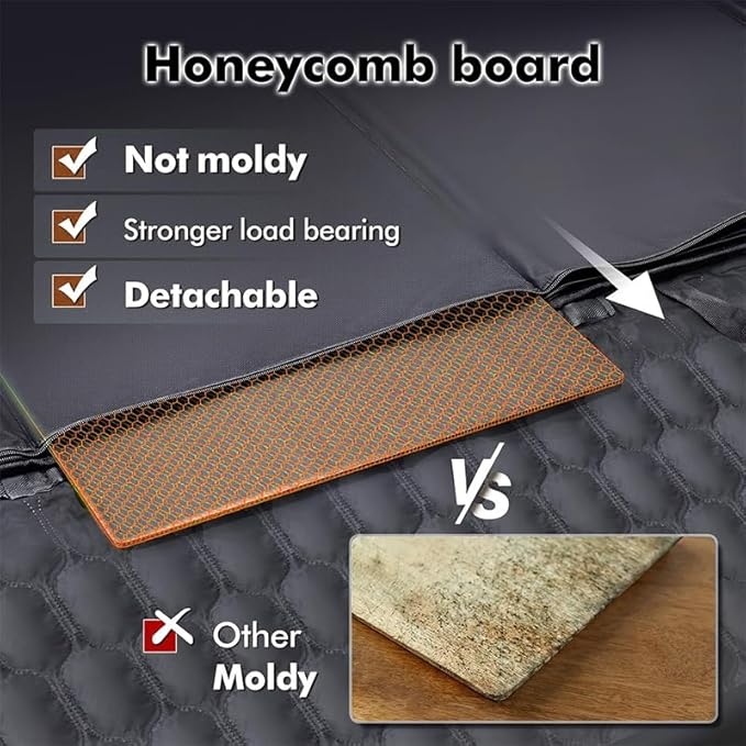 - 🐾【Strong Support Up To 400lbs & Extended Space】PANZZDA back seat extender for dogs build in 3 sturdy load bearing plates, up to 400lbs. Thick Load-bearing Plate used waterproof packaging, no need to worry about problems caused by moisture. Removable load plate for easy folding of dog car seat covers to meet your multiple needs. And the load-bearing plate extends backseat space, allowing your dog to walk around or stretch their limbs easily, enjoy the family car trip.
