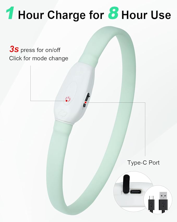 - Long-lasting Battery Life: Quick-charge your led collar in just 1 hour for over 6 hours of continuous use. Equipped with a convenient Type-C charging port, it's ready for any outing