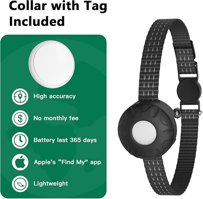 - 🐱【Global Tracking & Built-in Speaker】: Ring your cat tracker by playing sound in Find My App within bluetooth range; if the cat tracker tag is out of Bluetooth range, other Apple devices nearby (100ft range) can anonymously relay location back to its owner, ensuring broader coverage for tracking.
