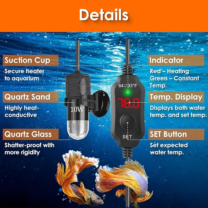 - OVERHEATING SAFEGUARD – Safety comes first. This betta heater will automatically stop running once the water temperature exceeds 97F. No more fretting about "cooking fish"!