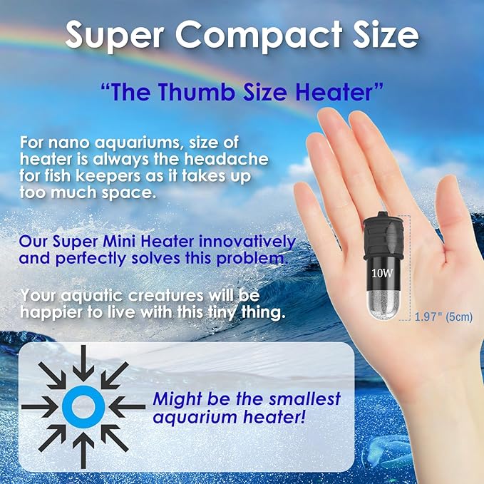 - SUPER MINI SIZE – This mini fish tank heater is just about the size of a thumb – only 1.97”(5cm) long. It's fantastic for nano tanks/betta tanks. The groundbreaking super tiny design brilliantly addresses the fish keepers' annoyance with traditional heaters! Occupies less space, easy to tuck away, but packs a punch in power! Temperature ranges between 64-93F, suitable for tanks up to 1 gallon.