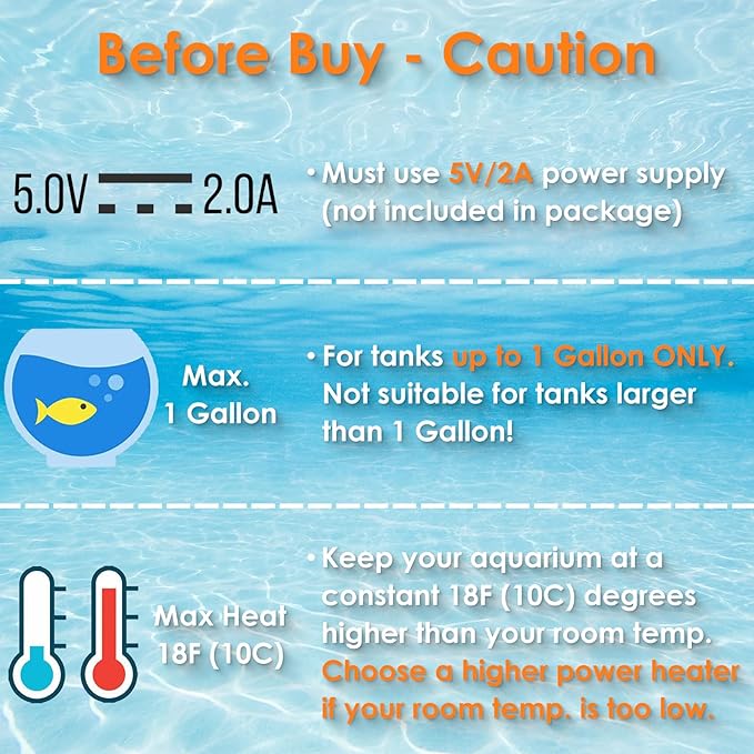 - 5V/2A USB POWER SOURCE – This ultra-safe 5V/2A USB power source keeps you worry-free from any potential electric shock risk to your cherished fish! Use a 5V/2A power adapter or a 5V/2A power bank to fuel up the heater. (Note: Power adapter or power bank not included)